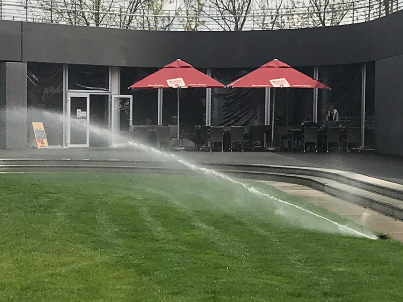 Riego especialmente diseñado para canchas de tenis. Los aspersores se adaptan por su forma y color